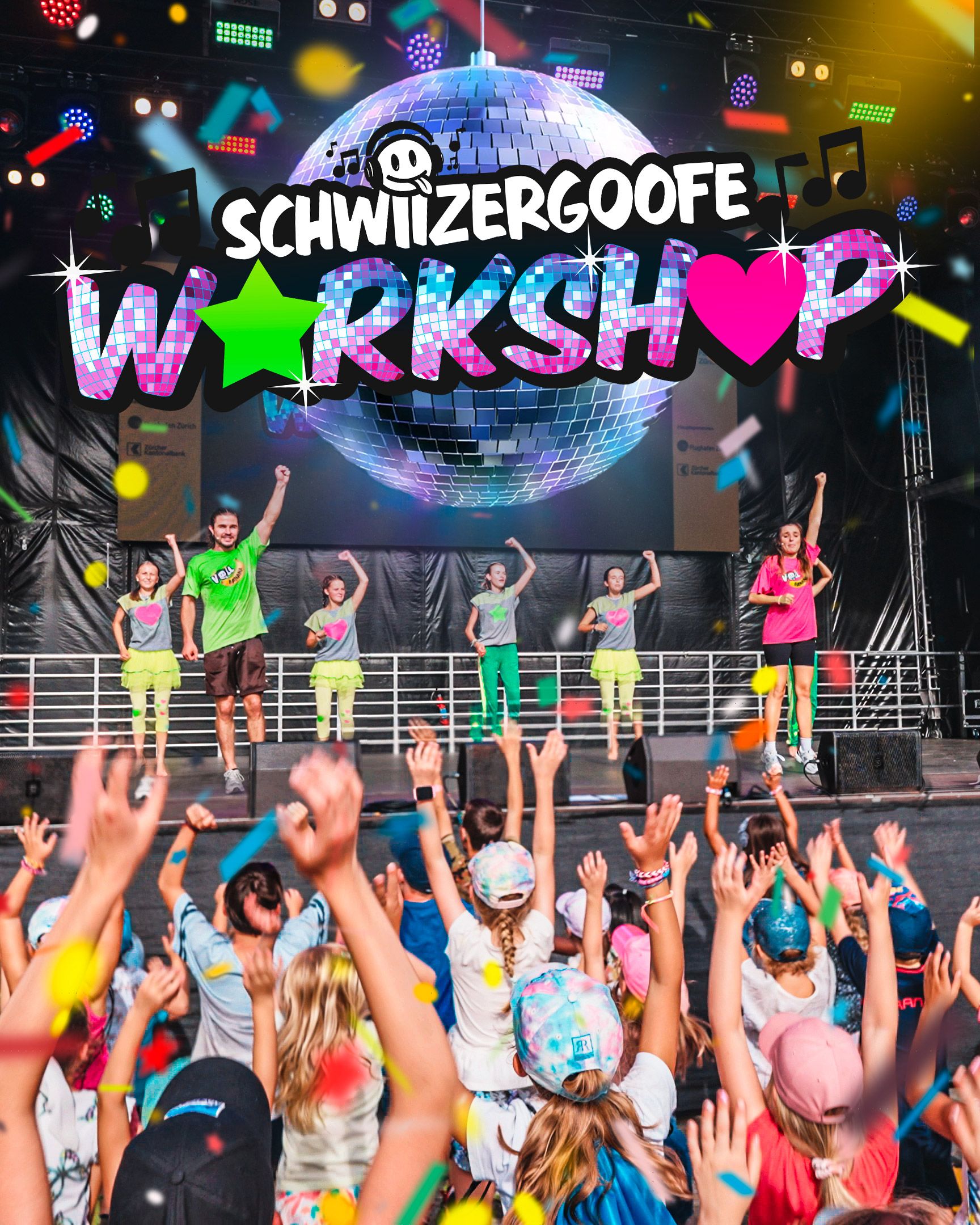 Die «Schwiizergoofe» sind keine feste Gruppe, sondern ein wachsendes Herzensprojekt, in welchem Kinder aus der ganzen Deutschschweiz mitmachen. Ihr Workshop ist ein Mitmach-Event für alle. Du singst und tanzt die grössten Goofe-Hits mit einer kleinen Gruppe Schwiizergoofe und ihren Coaches! Du folgst einer spannenden Geschichte und feierst vor der Bühne eine megagoofige Party.