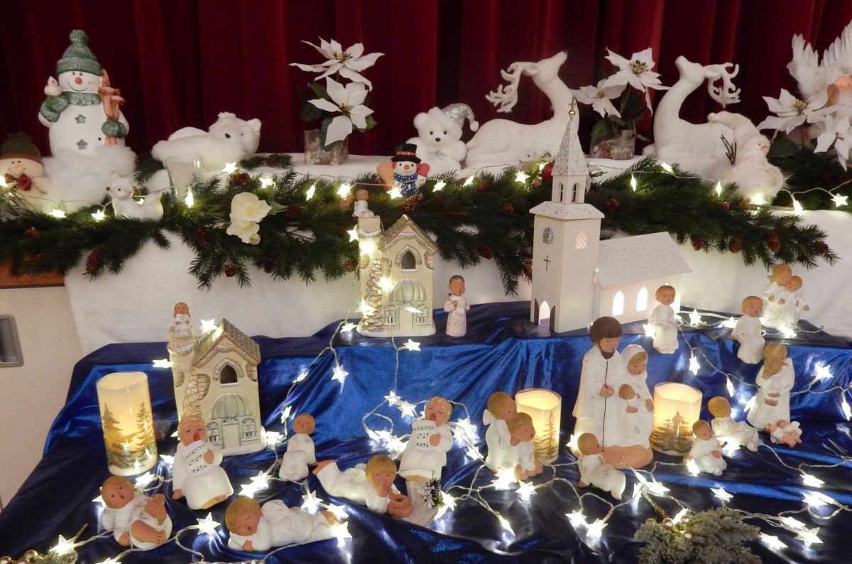 Am Mittwoch vor dem 1. Adventssonntag fanden sich gegen 60 Mitglieder im leicht abgedunkelten Saal des Pfarreiheims in Baar ein. Liebevoll und sorgfältig wurde der Christbaum geschmückt – ebenso der Bühnenrand mit vielen Figuren und Gegenständen aus der Märchen- und Sagenwelt. Auf einem Tisch ein kleines Dorf in imitiertem Schnee, mittendrin die Krippe. Auch die schön geschmückten Tischreihen waren ein Genuss für die Augen!