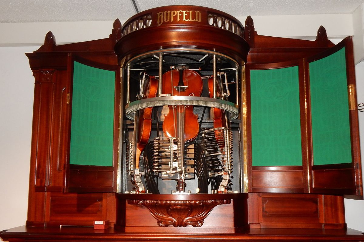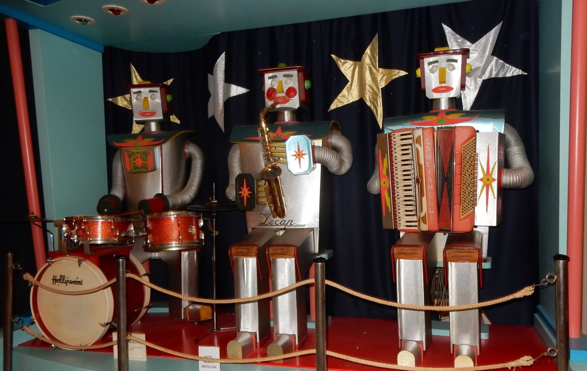 Die drei Männer, welche uns fachmännisch führten, brachten viele mechanischen Instrumente zum Klingen. Wir hörten Indoor-Orgeln von grossen Tanzsälen und Outdoor-Orgeln von Jahrmärkten. Wir bewunderten die grossen Musikdosen, Musikschränke, Puppenautomaten mit bewegenden Figuren und selbst-spielende Klaviere. Überhaupt waren wir von der Technik fasziniert. Musikschränke, Grammophons fand man früher nur in Häusern von wohlhabenden Familien. Gut konnte die Technik auch hier Fortschritte erzielen, dass diese klingenden Musikautomaten für mehr Leute erschwinglich wurden. Wir waren fasziniert von den umfangreichen Lochkarten und Musikrollen, welche für das Betreiben verschiedener Musikkästen geschaffen wurden. Das Eintauchen in das kulturelle und gesellschaftliche Leben des früheren 20. Jahrhundert liess bei vielen Erinnerungen aufkommen. Auch heute noch werden klingende Instrumente für Jahrmärkte und andere Anlässe produziert. Das konnten wir an einer Roboterband mit drei auf einer Bühne musizierenden Roboter-Musiker erleben. Das Mittagessen in einem stilvoll eingerichteten Saal mit einer grossen alten Tanzsaal-Orgel einzunehmen, machte das Klangerlebnis perfekt.
