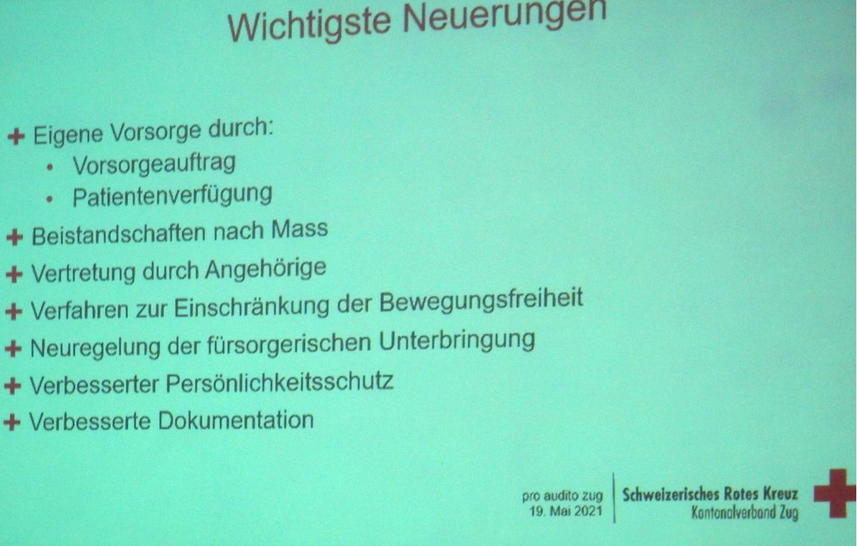 Dass das Thema des Vortrags vielen Teilnehmenden unter den Nägeln brennt, war absehbar. Brigitte Bart als nun pensionierte Leiterin des Roten Kreuzes Kantonalverband Zug erklärte auf verständliche Art und mittels Beamer, wie wichtig ein Vorsorgeauftrag sein kann. Als Beispiel seien die zunehmende Digitalisierung genannt mit vielen Codes, welche die betroffene Person nirgends aufgeschrieben hat. Bei Demenz oder plötzlichem Tod geistern deren Daten noch jahrzehntelang in vielen Kanälen im Internet um die ganze Welt. Bei frühzeitiger Vorsorge kann solches vermieden werden. Oder ein Vermögen kann nicht ohne juristische Schritte herausgegeben werden, ebenso ist ein eventueller Verkauf eines Hauses oder Wohneigentums nicht ohne weiteres möglich. Auf jeden Fall muss der Vorsorgeauftrag handschriftlich abgefasst sein.