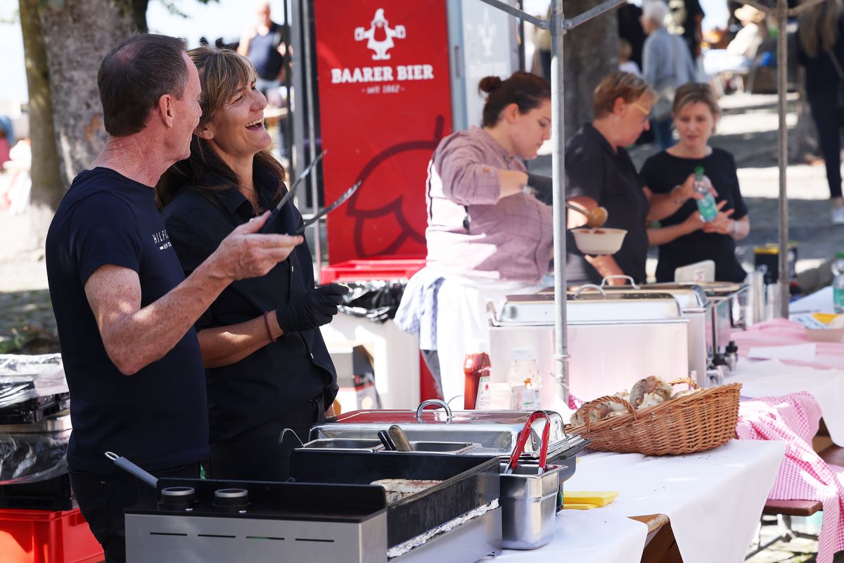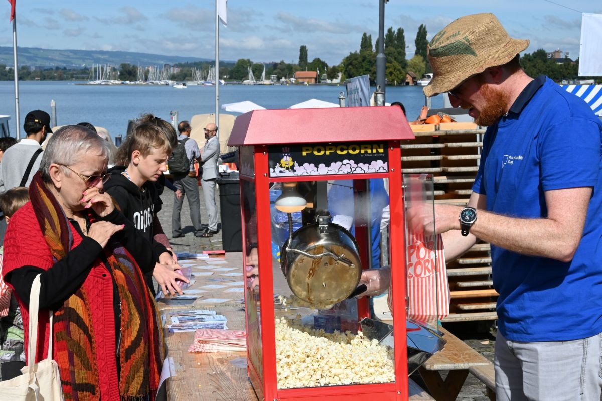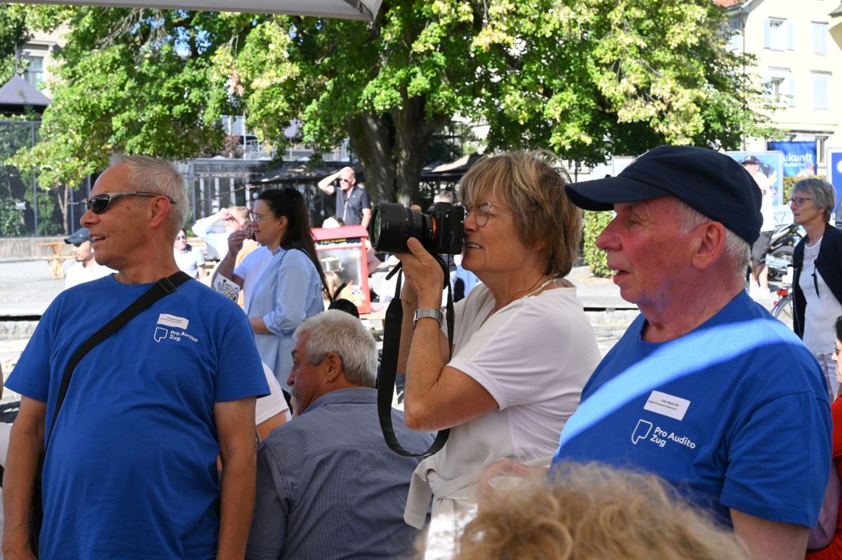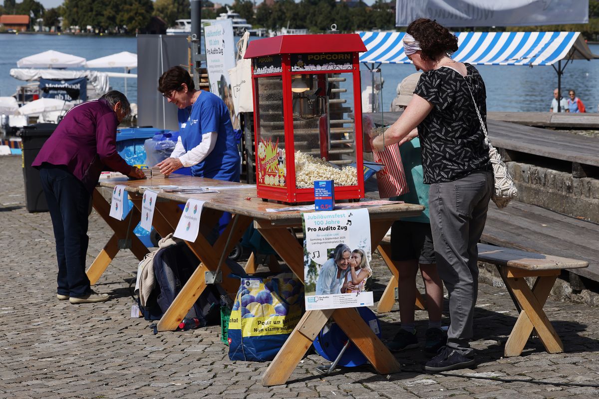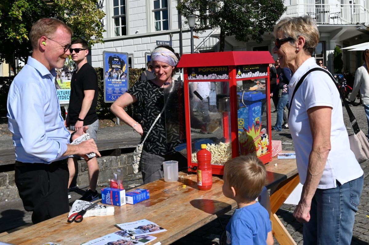 Gut angekommen waren auch der Kaffee- und Kuchenstand, der Essenstand von Restaurant Schiff und natürlich die Popcornmaschine, die ohne Unterbruch Popcorn produzieren musste. Viele Interessierte nutzten die Möglichkeit, sich ausführlich informieren zu lassen am Stand von Pro Audito Zug.